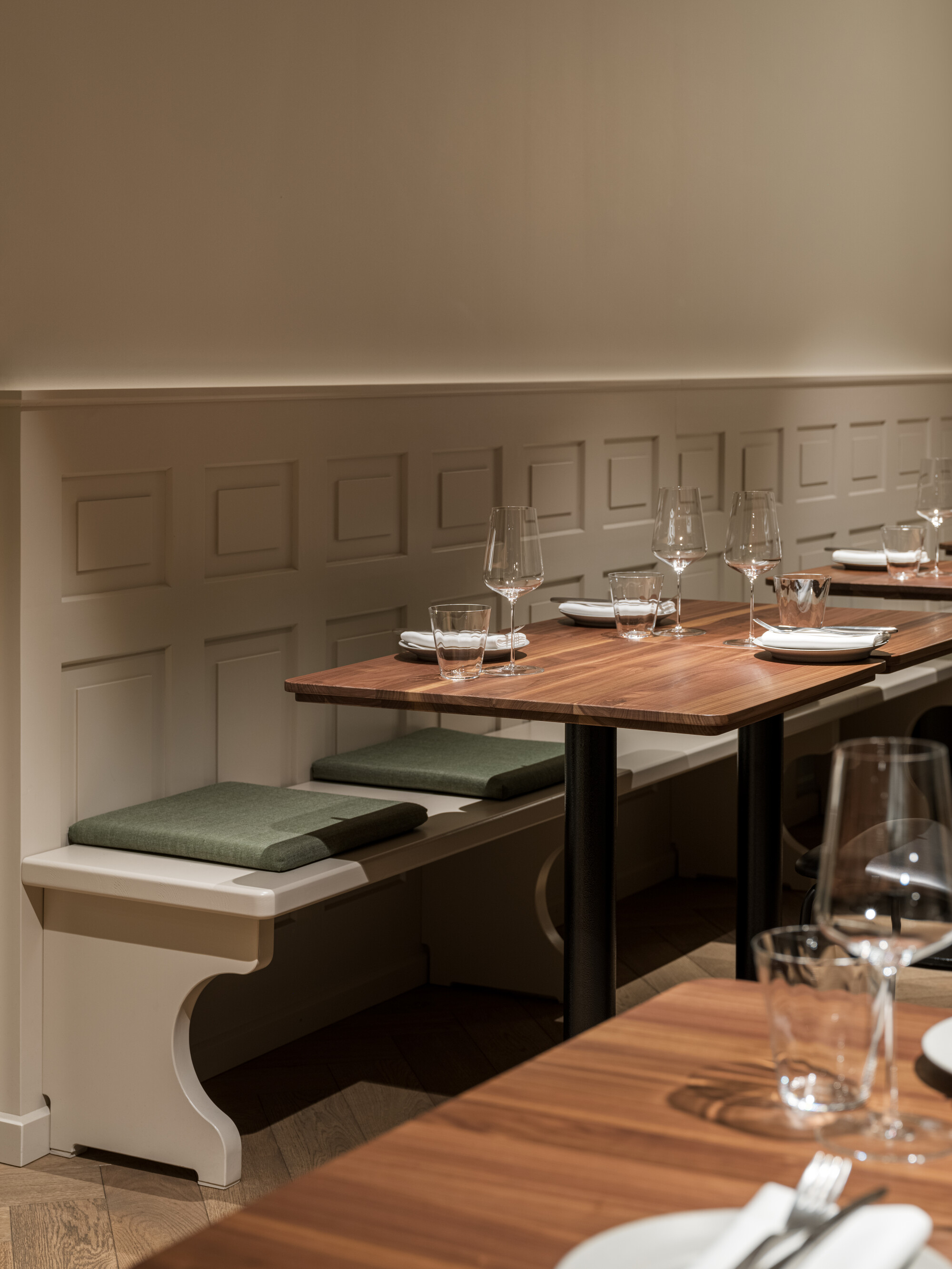 Die Liegenschaft beim Zürcher Lindenhof ist seit Beginn des 19. Jahrhunderts eine Gaststätte. Zuletzt standen die Räumlichkeiten rund zwei Jahre leer. Der innerhalb kürzester Zeit erfolgte Umbau des traditionsreichen Restaurants überführt die Gaststätte ins Heute. Eine einladende, gemütliche Atmosphäre geprägt von Grüntönen und Nussbaum unterstreicht das zeitlose Gestaltungskonzept.